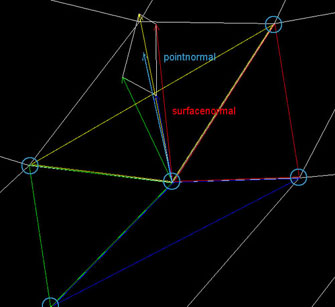 The point normals are calculated through the interpolation of the surface normals of the bordering triangles - in this case four - through vector calculations. The resulting pointvector represents a balanced direction of the surrounding surface parts.